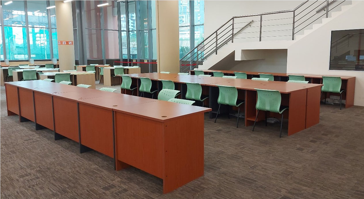 The library offers 24 dedicated laptop stations, each with access to an electrical outlet, allowing users to comfortably work with their personal laptops.